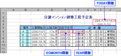 このような日付関数は大きく分けると、現在の日付を求める関数(TODAY、NOW)、日付のシリアル値を返す関数(DATE、DATEVALUE)、年/月/日の日付データから目的の日付データを求める関数(DAY、MONTH、YEAR、WEEKDAY)、2つの日付データ間の期間差を求める関数(DATEDIF、YEARFRAC、NETWORKDAYS、DAYS360)、指定した日数後(前)の日付を求める関数(EDATE、EOMONTH、WORKDAY)に分類されます。