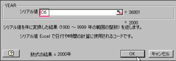 [YEAR] を選択し [OK] ボタン。シリアル値にはC6を指定。同様に「月」のみを求める場合は