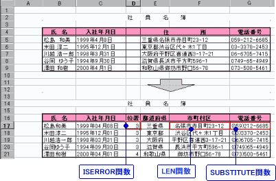 | SUBSTITUTEは文字列を別の文字列に置き換える関数。ツールバーの [編集]→[置換] では、電話番号の市外局番のみを()で囲むといったことはできないが、この関数ならば文字列を頭から置換するので可能。 | ||