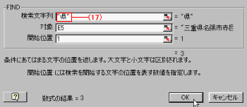 (17)「検索文字列」には゛県”、「対象」はE5、「開始位置」は1と入力し[OK]ボタン。を押す。