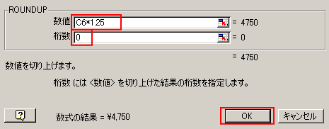▼数値を「切り上げる」場合はROUNDUP関数を使う。ここではROUND関数と同様にC列に仕入値に1.25を掛け、切り上げている。桁数もROUND関数と同様の設定。 ![]()