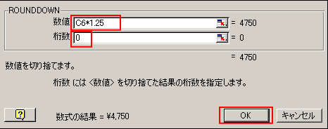 ▼C列「仕入値」に1.25を掛け、四捨五入したものを「定価」とする。(1)定価を出すセルD6を選択。(2)[関数貼り付け]ボタンを押す。「関数の貼り付け」画面で、「関数の分類」で(3)[数学/三角]を、「関数名」で(4)[ROUND]を選び、(5)[OK]ボタンを押す。 ![]() ▼表示されたROUNDの「数式パレット」で、「数値」には(6)[C6*1.25]、「桁数」には小数点以下なしの整数で表示させたいので(7)[0]と入力し、(8)[OK]ボタンを押す。 ![]() D6に入った式は =ROUND(C6*1.25,0)
