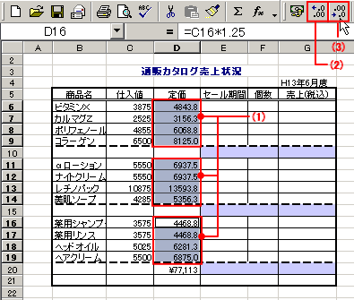 ▼(1)定価を求める式の入ったセル範囲を選択、(2)[小数点以下桁下げ]ボタンを押しつづけると、小数点で表示されていた部分が四捨五入され整数表示になる。逆に(3)の[桁上げ]ボタンを押すと、小数部分が表示される。 ![]()
