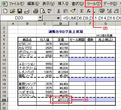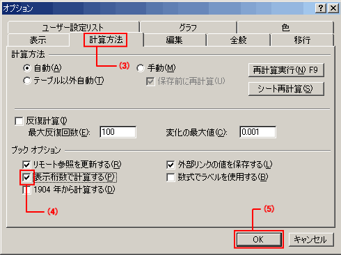 ▼(1)D20のセルには各定価の合計額を出した。しかしここでは小数点以下を表示させていないだけなので、小数点以下部分も含めた合計値が計算されている。そのため数値を四捨五入後計算した値とは異なってしまう。 ![]() ▼そこで四捨五入した定価の値の合計と一致させる場合は、(2)[ツール]→[オプション」で表示される画面で(3)[計算方法]タブを選び、「ブック オプション」の(4)[表示桁数で計算する]をチェックし(5)[OK]ボタンを押そう。これで正しい合計値が求められる。 ![]()