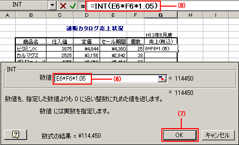 ▼(1)G6セルは売上額(税込)を求める式として定価に個数を掛けた値に、1.05を掛け消費税込みの値を求めている。税込額の場合、数値は小数点以下切り捨てで計算するので、ここでは切り捨てる関数としてINTを利用。(2)[関数貼り付け]ボタンを押し(4)[INT]を選ぶ。 ![]() ▼INTの数式パレットが表示される。(6)「数値」にE6の価格にF6の個数を掛け合わせ、さらに消費税込みの値を求めるために1.05を掛け合わせる。(7)[OK]ボタンを押すと、小数点以下を切り捨てた値が求められる。 ![]() G6のセルに入った式は =INT(E6*F6*1.05)