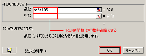 ▼TRUNC関数でも小数点以下を切り捨てることができる。使い方はINTと同様。数式パレットでは「桁数」が表示されるが、これは省略してもOK。INTとの違いは負の場合の処理。たとえば「-1.6」を「数値を超えない最大の整数を出す」INTで切り捨てると「-2」、TRUNCの場合「-1」となる。 ![]()