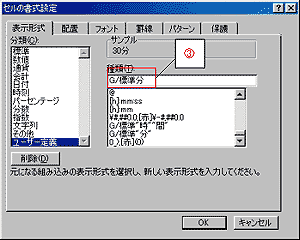 「30分」と表示されたセルの場合は.. セルに8時30分と入力しても、セルの値を確認すると、自動的に8:30となっているので確認してみよう。しかし、30分と入力しても、文字列の30分と入力されてしまう。その為、このまま勤務時間の計算式をたてても、文字列を含んでしまう為@エラーが出て正しく答えを求める事ができない。このような時は、表示上は文字列が表示されるようにして実際は数値のみがセルの値となるように表示形式を変更すればよい。 |