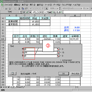 | エクセルでは日付や時刻はそれぞれ「連続する数値」として扱われている。これをシリアル値という。 TIME関数は時刻をシリアル値に変更する関数。ここでは休憩時間だけが「30分」といった表記のため、この分数をいったんシリアル値に変換して総勤務時間を求めている。 |