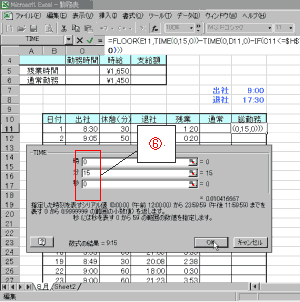 C休憩の数値を時刻のシリアル値に変換するため、分に休憩のセルDの4番地を選択、「OK」ボタンをクリックする。 |