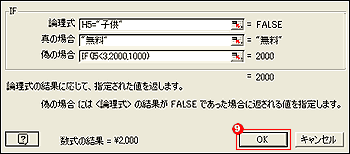 1.条件は[ ]でくくり、条件に合った場合にセルに表示させる値を""で囲んで入力する。 すると、3未満の数値を入力すると、2000円と表示され、3以上の数値を入力すると、1000円と表示される。 |