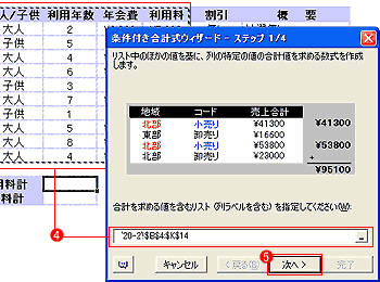「条件付き合計式ウィザード」は、ウィザードを指定するだけで、複数の条件がつけられる。しかし、AND条件しかつけることができない。また、リスト内にセルの結合や、ユーザー定義で表示形式を設定しているとうまく認識されない。利用する前に、それぞれを外しておくことが必要。 |