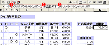 ここでは、未登録番号を入力すると、「未登録です」というコメントを表示させ、登録番号の場合は、利用料を集計するという数式を設定する。