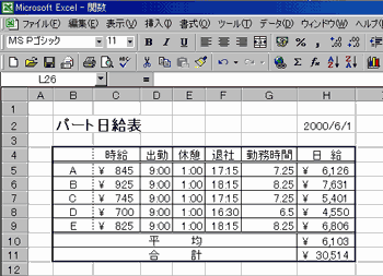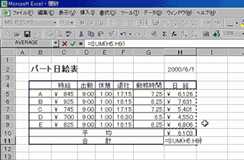 時間の計算は通常の計算式と同様に、退社時間から出社と休憩時間を引く事により求められる。しかし時間データはシリアル値なので時給をかけて計算する場合は1時間単位の時間数に変換する必要がある。通常の数式を1時間を表すシリアル値である[1:0:0]で割る事により求め、時刻の表示形式を標準に変更する。