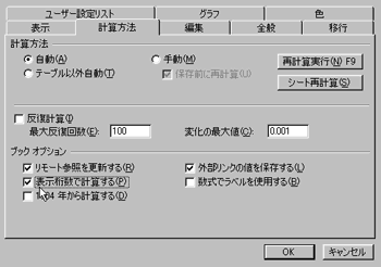 合計は実際の値より1円多く表示される。これはデータを通貨の表示にすると小数点以下が四捨五入されてしまうことによる。ツールメニューの[オプション]ダイアログの[計算方法]パネルで[表示桁数で計算する]にチェックを入れると表示した桁数で答えが求められる