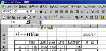 簡単な計算式は関数を使用せずに数式バーを利用する。日給を求めるセルをクリックする。数式バーをクリックし関数の書式に従い式を入力する。ここで数式パレットを利用する場合は[数式の編集]ボタンをクリック。