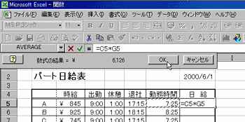 数式パレットが表示される。Cの5番地をクリックしテンキーから[*]を入力しGの5番地をクリックする。数式バーに式が正しく入力されているか確認しさらに数式パレットで計算結果を確認、[OK]ボタンをクリックすると日給が求められる。