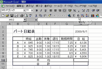 平均を求める場合は統計関数の中のAVERAGE関数を利用する。平均を求めるセルHの10番地をクリックし、[関数貼り付け]ボタンをクリックする。[関数の貼り付け]ダイアログが表示される。