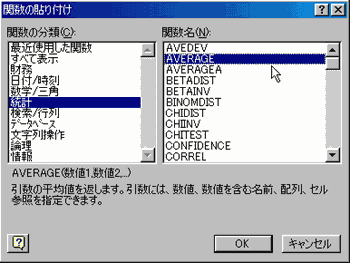 関数の分類ボックスから[統計]を選択し、関数名一覧の中から[AVERAGE]関数を選択し[OK]ボタンをクリックする。ここで関数名の頭文字をキーボードから入力すると素早く[関数名]ボックスに目的の関数が表示される。