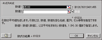 数式パレットが表示される。ダイアログ縮小ボタンをクリックすると数式パレットが縮小表示されるので、データであるHの5番地からHの9番地を範囲選択し[OK]ボタンをクリックすると平均を求める事ができる。