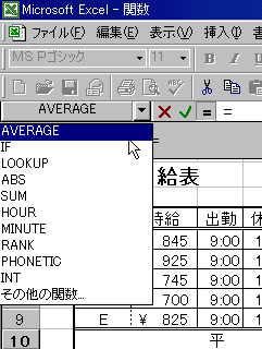 [数式の編集]ボタンをクリックすると、[名前ボックス]が[関数ボックス]に変わるのでクリックすると最近使用した関数10個が表示される。一覧から選択すると数式パレットが表示される。また[その他の関数]をクリックすると[関数の貼り付け]ダイアログが表示される。