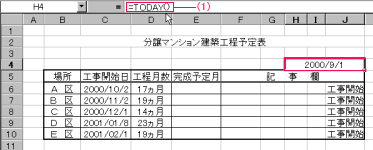 | TODAY関数で現在の日付が表示できる。目的セルに「=TODAY()」と入力。括弧だけで、引数は入れない。「=NOW()」で日付と時刻が表示できる。日付を確定する場合は [F9] キーを押す。 | |
