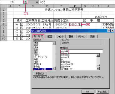 (6)F6をクリックして、(7)数式バーのイコールボタンをクリックし、C6をクリックしてセルの参照式を設定する。F6セルの[表示形式]