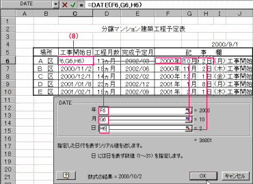 別々のセルに表示された日付データを1つのセルに表示させるには、DATE関数を利用する。たとえば(8)C6のセルを選択、[DATE]