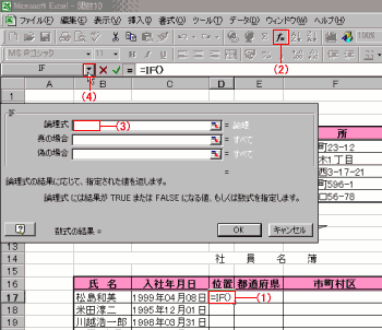 住所から都道府県のみを抽出する場合、都道府県の文字数を求めLEFT関数で左から文字数分の文字列を抽出。その際、FIND関数で検索文字の位置を求めるが、検索文字が「県」だけではないため、エラー値が表示される。そこでIF関数でエラー値だった場合(都道府の場合)でもセルに値を表示させる式を設定。まず(1)新たに列を挿入し、D17を選択し(2)[関数の貼り付け] ダイアログからIF関数を選択。(3)「論理式」で(4)をクリック。