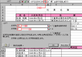 | ISERRORとは検査セルのエラー値かどうかを調べる関数。ここではFIND関数で住所の頭4文字以内に「県」が含まれているかどうか調べ、IF関数と組み合わせ、都道府県名が3文字か4文字かを求めている。 | ||