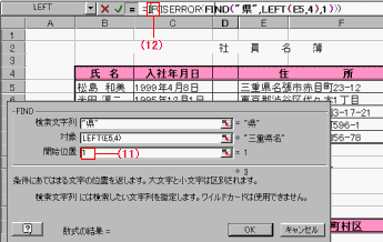 (11)「開始位置」を1とし、(12)数式バーのIFの位置をクリック、IF関数に戻る。
