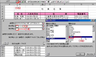 (13)「真の場合」には、エラー値だった場合、セルに表示される文字列を入力するので、3と入力(左から4文字以内に県が現われない文字列でエラーの場合、都道府名で必ず3文字のため)、(14)「偽の場合」には、エラー値でない場合、県の位置を求めて入力するので、(15)を押し、(16)FIND関数を選択。