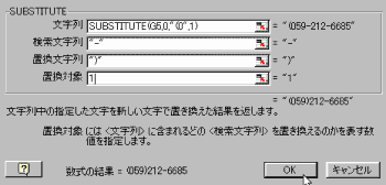 | SUBSTITUTEは文字列を別の文字列に置き換える関数。ツールバーの [編集]→[置換] では、電話番号の市外局番のみを()で囲むといったことはできないが、この関数ならば文字列を頭から置換するので可能。 | ||