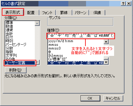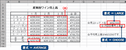 文字と数字を組み合わせて表示する![]() H11のセルには、F13で求めた平均売上高が表示されるようになっている。さらにH11セルで右クリック→[セルの書式設定]→[表示形式]のタブを選び、「分類」で[ユーザー定義]、「種類」の下のボックスに["☆平均売上高は"\#,###"です"]と設定、[OK]を押す。「\#,###」は数字を3桁区切りの\表示にする設定。文字列は「"」で囲む。 |