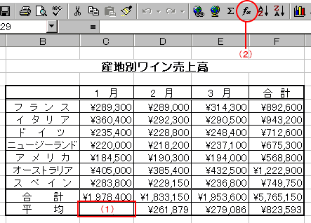 ▼(1)平均値を求めるセルC13を選択。ツールバーの(2)[関数貼り付け]ボタンを押す(左隣の「?」は合計を出すときに便利な[オートSUM]ボタン)。
