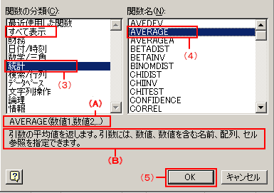 ▼「関数の貼り付け」画面が表示。「関数の分類」で(3)[統計]を選ぶ。分類名が不明なら[すべて表示]を選ぶ。「関数名」で(4)[AVERAGE]を選択、[OK]を押す。(A)引数や(B)関数の意味もここで確認できる。