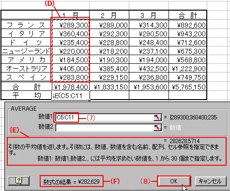 ▼数式パレットには自動的に「C5:C11」と指定されているが、C5からC11の範囲の平均を求めたいので、マウスポインタでC5:C11に範囲修正((D))。すると数式パレットに(7)「C5:C11」と表示。(8)[OK]を押すと、答えが求められる。(E)引数の説明や(F)数式の結果もここで確認できる。