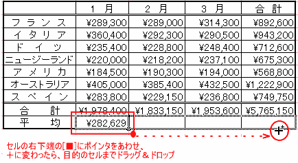 ▼設定の式を横のセルにもコピーする。C13セル右下端の[■]にマウスポインタをあわせ+印に変わったら、目的のセル(F13のセル)までドラッグ&ドロップ。D13〜F13に各範囲の平均値を出す式が設定された。