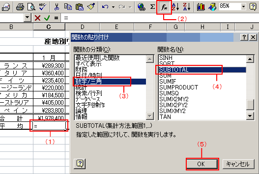 ▼SUBTOTAL(サブトータル)関数を使うと、平均、最大値、最小値などが求められる。(1)C13セルを選択、(2)[関数貼り付け]ボタンをクリック。「関数の貼り付け」画面で(3)[ 数学/三角]、(4)[SUMTOTAL]を選び、(5)[OK]を押す。