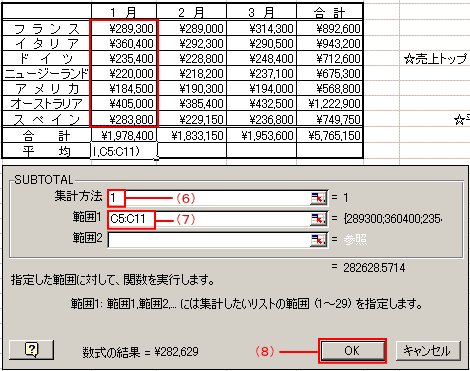 SUBTOTALの「集計方法」は、1:AVERAGEは平均、2と3のCOUNTとCOUNTAはデータ個数を求めるもの、4:MAXは最大値、5:MINは最小値、6:PRODUCTは引数の積、7と8のSTDEV、STDEVPは標準偏差値を求めるもの、9:SUMは合計、10:VARは統計上の分散を求める。