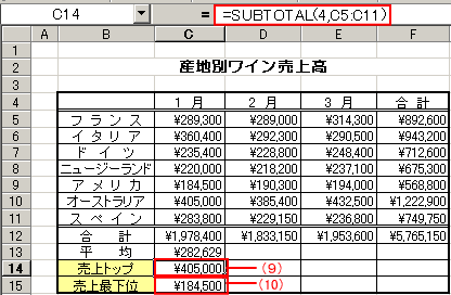 ▼SUBTOTALを使い、C5:C11範囲の最大値をC14に、最小値をC15に出す。(9)には「=SUBTOTAL(4,C5:C11)」、(11)には「=SUBTOTAL(5,C5:C11)」と、ともに集計方法を変えるだけで答えが求められた。