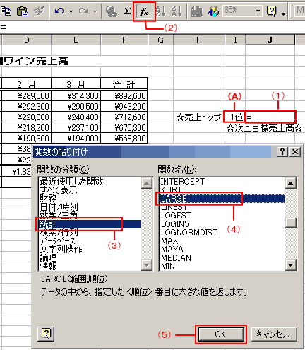 ▼ここでは売上高のうち、(A)に入力された「1」位のものを抽出する式を設定する。式を入れる(1)J7のセルを選択。(2)[関数貼り付け]ボタンを押し、表示された「関数の貼り付け」画面の「関数の分類」で(3)[統計]を選択、「関数名」で(4)[LARGE]を選択、(5)[OK]を押す。
