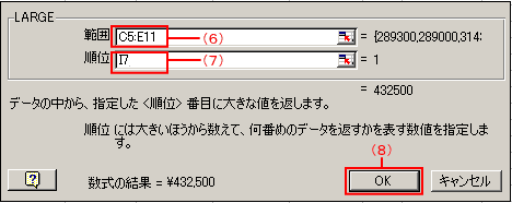 ▼「範囲」に(6)[C5:E11]を、「順位」に(7)[I7]を選択。なおI7のセルは、「1」と数字だけを入力しても「1位」と表示されるよう、「表示形式」の[ユーザー定義]で[G/標準"位"]と設定している。