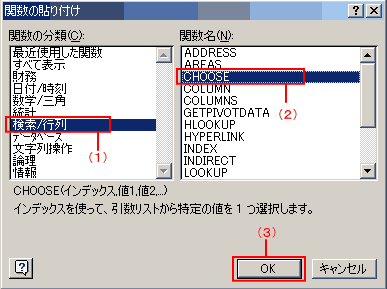 | 書 式 | =CHOOSE(インデックス,値1[,値2,…]) | ||||