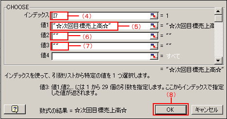 ▼「インデックス」には(4)[I7]を選ぶ。「値1」はI7に入った数字が「1」の場合の表示(5)を設定。(6)「値2」、(7)「値4」にはI7に「2」「3」が入った場合、空白にするよう「""」とだけ設定する。