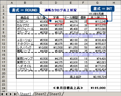 | 小数部分を切り捨て、整数部分だけを表示させる場合はINT関数を使う。ただし数値が負の場合は、INTは「数値を超えない整数」を出す関数のため、たとえば「−1.7」は「−2」となる。数値を切り捨てる関数としてはTRUNC関数もある。TRUNCでは「−1.7」は「−1」と求められる。 | |||||