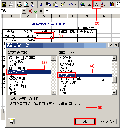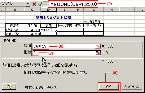▼C列「仕入値」に1.25を掛け、四捨五入したものを「定価」とする。(1)定価を出すセルD6を選択。(2)[関数貼り付け]ボタンを押す。「関数の貼り付け」画面で、「関数の分類」で(3)[数学/三角]を、「関数名」で(4)[ROUND]を選び、(5)[OK]ボタンを押す。 ![]() ▼表示されたROUNDの「数式パレット」で、「数値」には(6)[C6*1.25]、「桁数」には小数点以下なしの整数で表示させたいので(7)[0]と入力し、(8)[OK]ボタンを押す。 ![]() D6に入った式は =ROUND(C6*1.25,0)