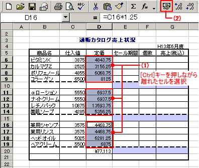 ▼(1)定価を求める式の入ったセル範囲を選択、(2)[小数点以下桁下げ]ボタンを押しつづけると、小数点で表示されていた部分が四捨五入され整数表示になる。逆に(3)の[桁上げ]ボタンを押すと、小数部分が表示される。 ![]()