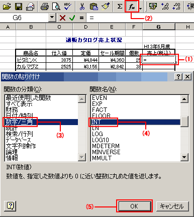 ▼(1)G6セルは売上額(税込)を求める式として定価に個数を掛けた値に、1.05を掛け消費税込みの値を求めている。税込額の場合、数値は小数点以下切り捨てで計算するので、ここでは切り捨てる関数としてINTを利用。(2)[関数貼り付け]ボタンを押し(4)[INT]を選ぶ。 ![]() ▼INTの数式パレットが表示される。(6)「数値」にE6の価格にF6の個数を掛け合わせ、さらに消費税込みの値を求めるために1.05を掛け合わせる。(7)[OK]ボタンを押すと、小数点以下を切り捨てた値が求められる。 ![]() G6のセルに入った式は =INT(E6*F6*1.05)