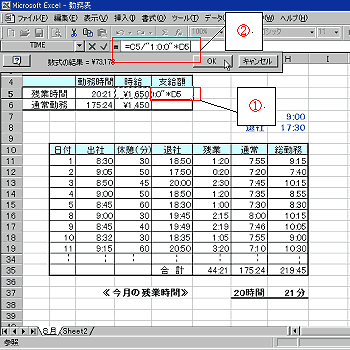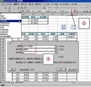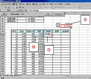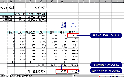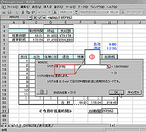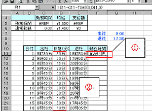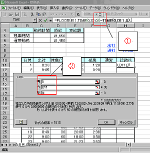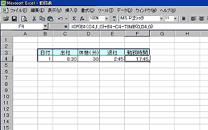 | エクセルでは日付や時刻はそれぞれ「連続する数値」として扱われている。これをシリアル値という。 TIME関数は時刻をシリアル値に変更する関数。ここでは休憩時間だけが「30分」といった表記のため、この分数をいったんシリアル値に変換して総勤務時間を求めている。 |