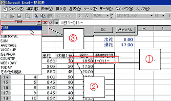 「退社−出社−休憩」で勤務時間を求める @勤務時間を求めるセルFの11番地を選択、数式の編集ボタンをクリック、A退社のセルEの11番地をクリック、[−]を入力、出社のセルCの11番地をクリック、[−]をクリック、関数ボックスからB「TIME」関数を選択する。(一覧に無い場合は、その他の関数を選択、日付/時刻関数からTIME関数を選択)